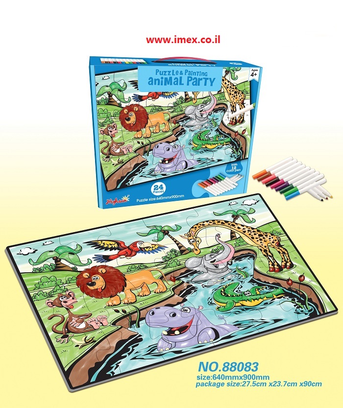 פאזל ריצפה 24 חלקים גדולים מסיבת חיות- Animals Party גודל החלקים 16 * 15 ס"מ. גודל הפאזל 64 * 90 ס"מ. מיועד לגילאי +3. מגיע עם טושים לצביעה